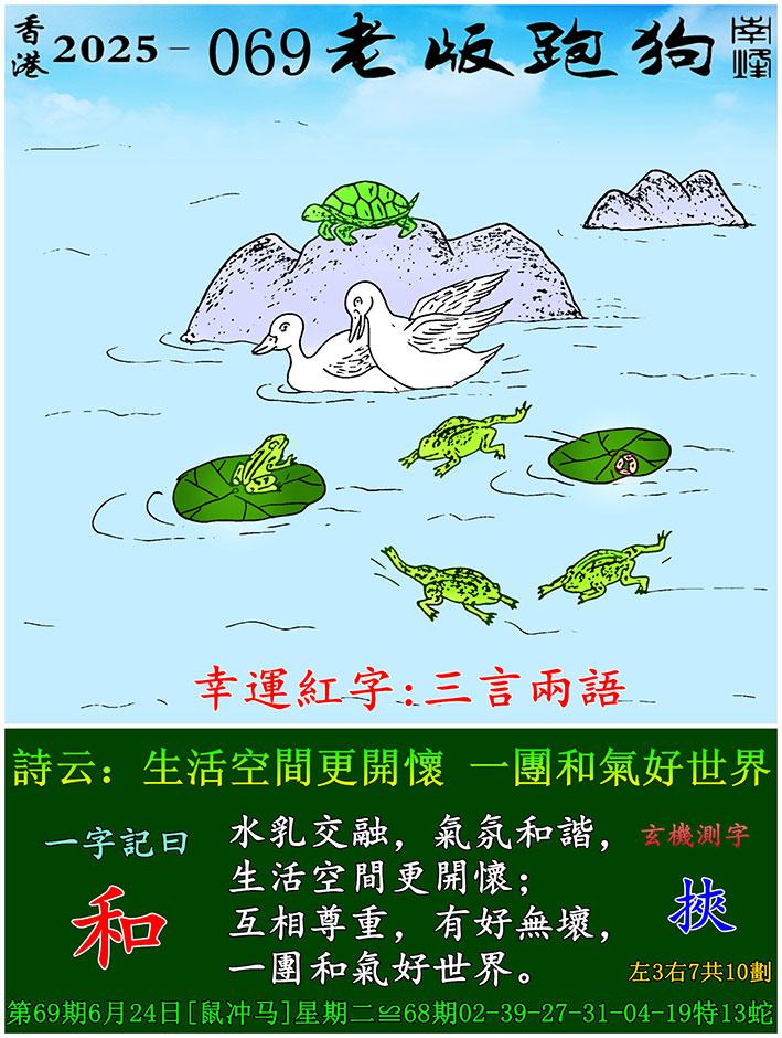 069期老版跑狗一字記之曰:【和】 詩雲:生活空間更開懷,一團和氣好世界。