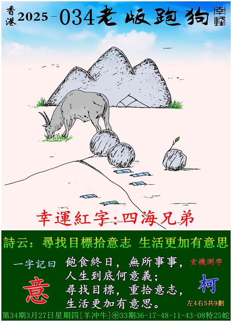 034期老版跑狗一字記之曰:【意】 詩雲:尋找目標拾意志,生活更加有意思。