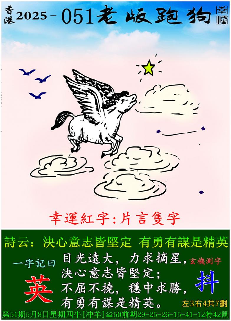 051期老版跑狗一字記之曰:【英】 詩雲:決心意志皆堅定,有勇有謀是精英。