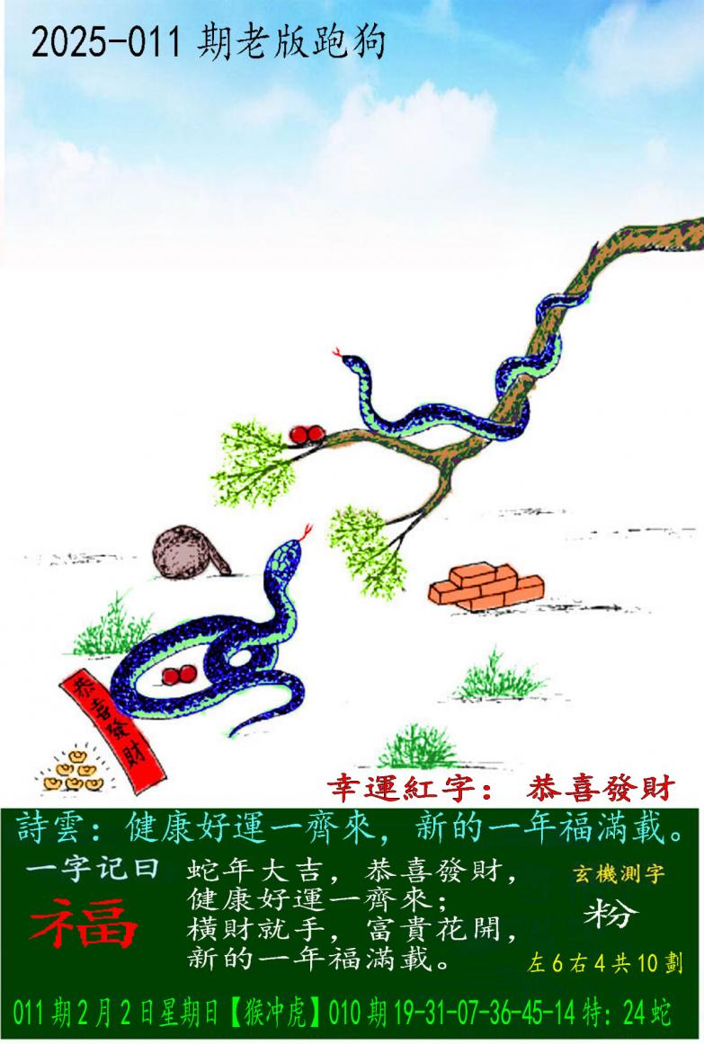 011期老版跑狗一字記之曰:【福】 詩雲:健康好運一齊來,新的一年福滿載。