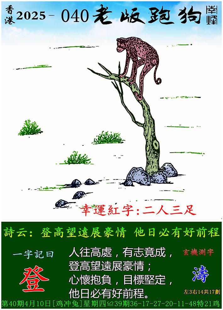 040期老版跑狗一字記之曰:【登】 詩雲:登高望遠展豪情,他日必有好前程。