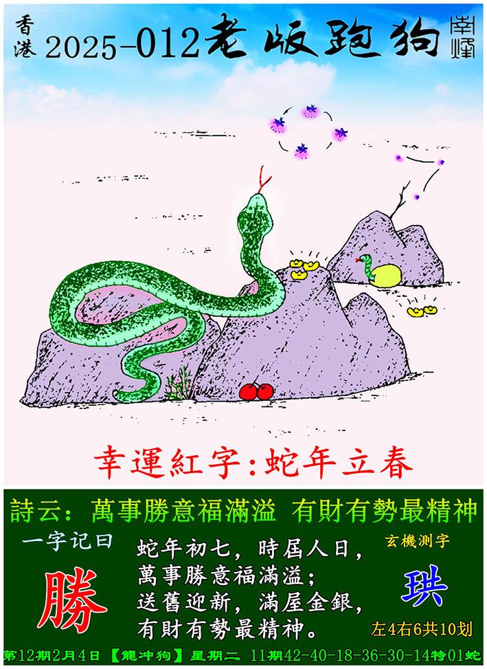 012期老版跑狗一字記之曰:【勝】 詩雲:萬事勝意福滿溢,有財有勢最精神。