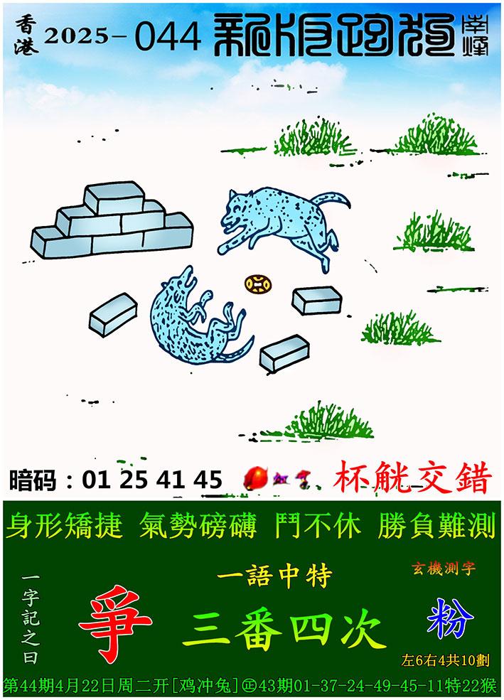 044期新版跑狗一字記之曰:【爭】 玄機測字:《粉》 一語中特:三番四次